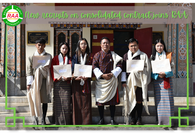 The Royal Audit Authority welcomed five Assistant Audit Officers on Consolidated Contracts with effect from 01 February 2026. The Auditor General and RAA family received the new recruits with Trashi Khadhars and awarded their Appointment Orders in a modest appointment ceremony on 02 February 2026 at the RAA Head Office.