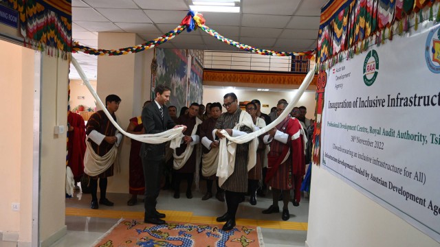 The Royal Audit Authority (RAA) inaugurated an inclusive facility at its Professional Development Centre (PDC) in Tsirang on 30th November 2022. The training center was retrofitted with funding support from the Austrian Development Agency and the facilities in PDC are now accessible to everyone, including Persons with Disabilities. Modifications, handrails and tactile floorings were added and effected to training rooms, hostels, computer lab, dining rooms, washrooms and entry/exit doors. The retrofitting works was carried out at the cost of Nu.3.8 million. With modification of the infrastructures, the RAA aspires to provide a conducive learning environment for training participants with disabilities at the PDC. The inauguration ceremony was graced by Mr. Gerhard Adam, Head of Austrian Coordination Office, Thimphu.